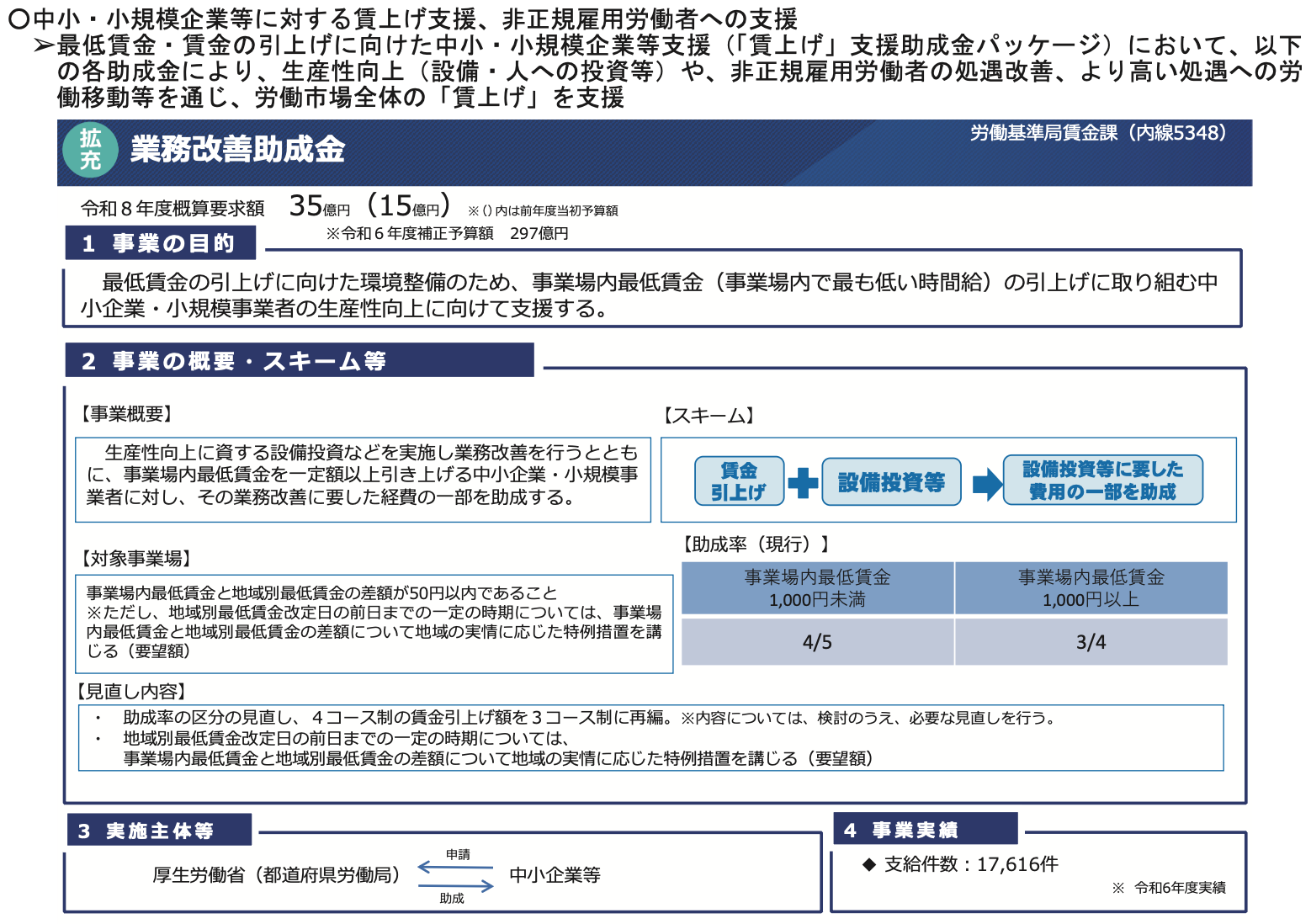 業務改善助成金として約35億円規模の予算が概算要求されています。